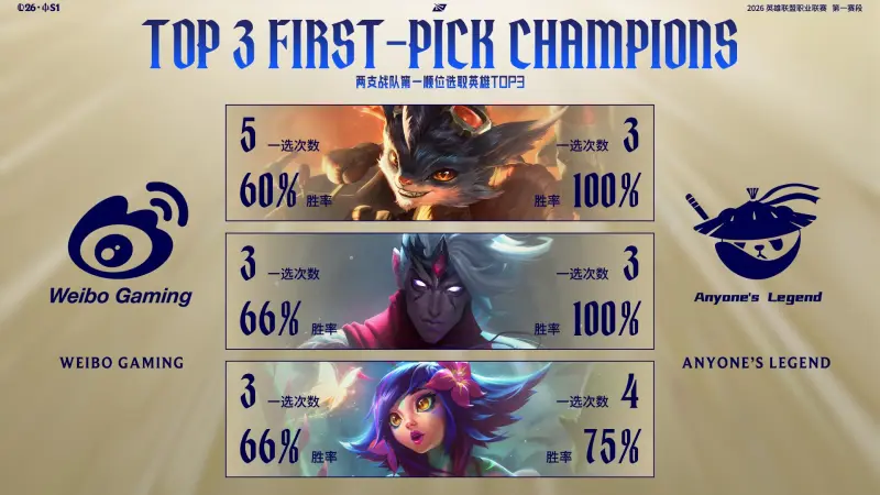 2026LPL第一赛段至今,WBG与AL第一顺位选取英雄TOP3如图所示;