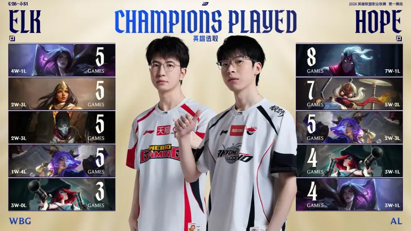 2026LPL第一赛段至今,Elk与Hope数据对比及英雄选取一览。