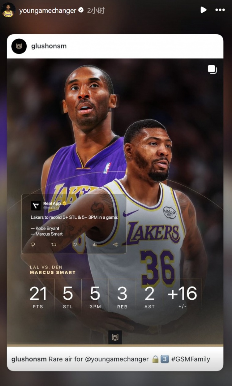 3月16日讯 昨天的一场NBA常规赛,湖人主场以127-125加时险胜掘金。此役,斯玛特出战35分钟,投篮15中8,三分12中5,得到21分3篮板2助攻5抢断1盖帽。据统计,斯玛特单场至少5抢断5三分,湖人队史第二人,比肩科比。斯玛特今天在社媒也转发了该里程碑。...