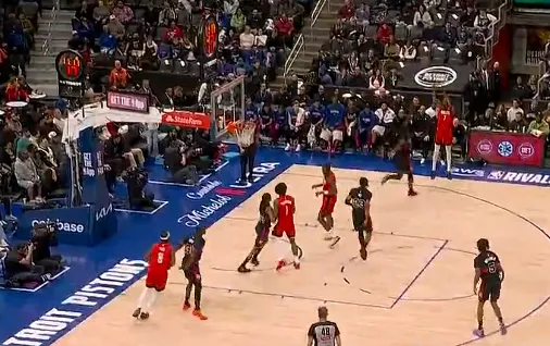 比赛的第二节,杜兰特接球三分再中,火箭领先活塞到11分分差。